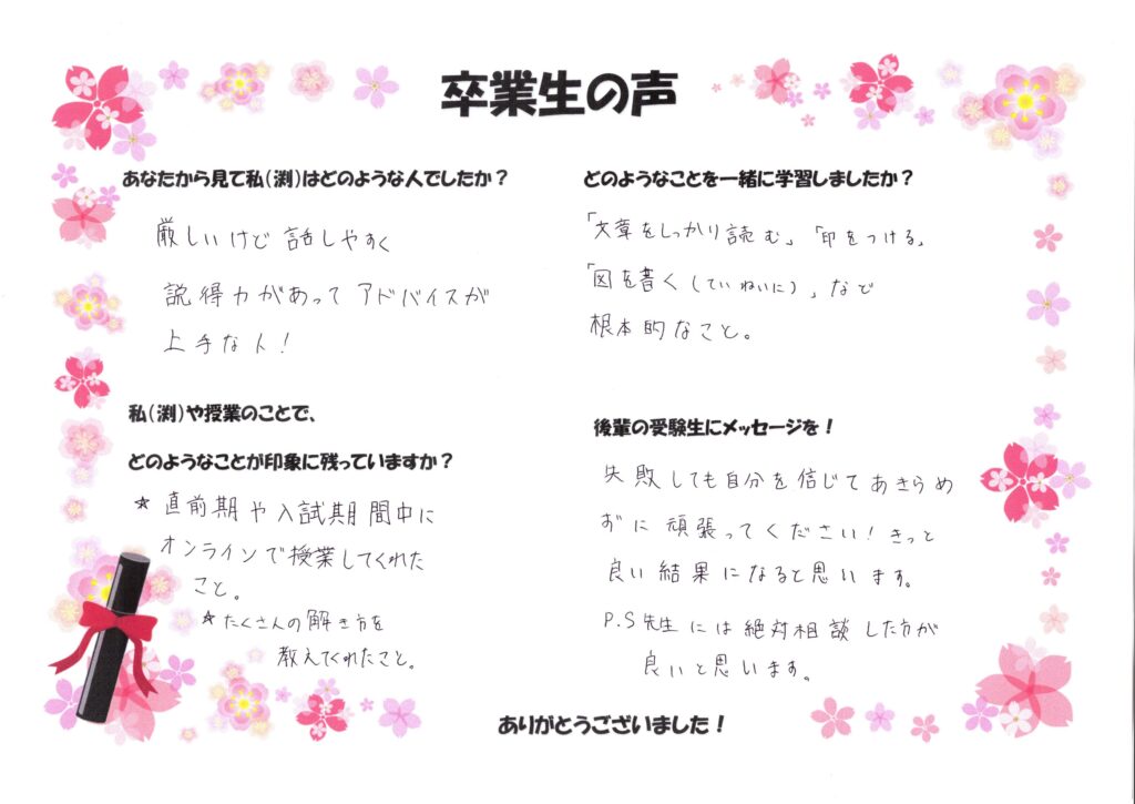 授業が比較的遅い時間にスタートすることもあって疲れが見えることもありましたが、よくがんばってくれました。想像以上にさまざなことを吸収してくれ、特に入試直前期は安心して見ていられました。素晴らしい成長でした。